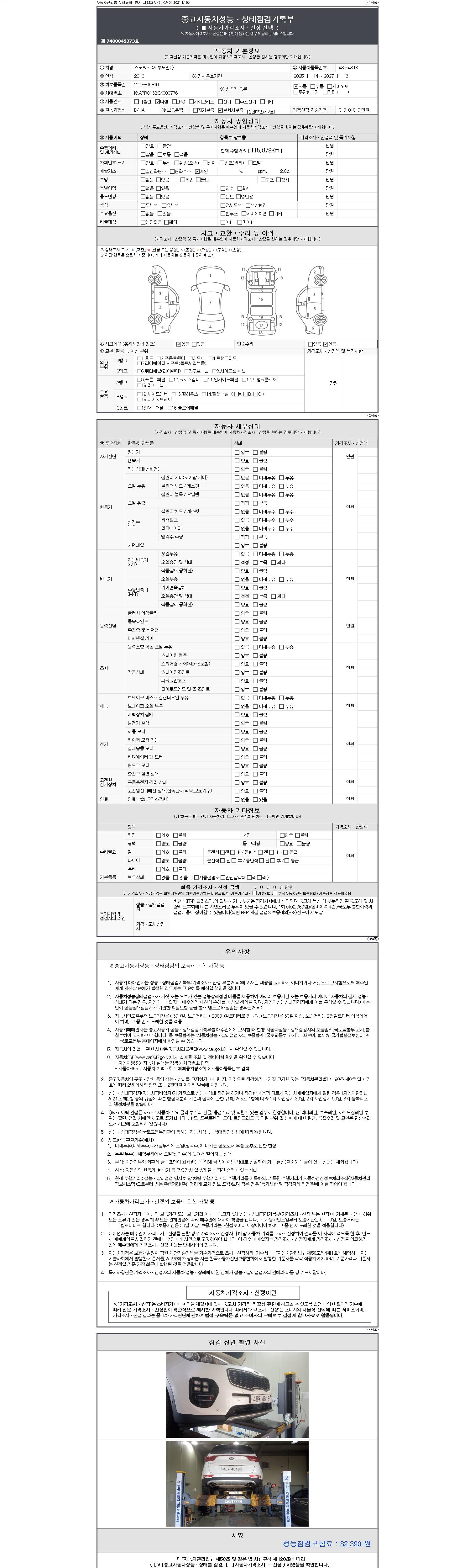 자동차관리법 시행규칙 제120조의 규정에 따라 별지 제 82호서식 《중고자동차 성능, 상태점검 기록부》를 발행한 성능, 상태점검자 및 매매자는 아래의 보증기간 또는 보증거리 이내의 중고자동차, 성능점검 기록부에 기재된 내용과 자동차의 실제 성능, 상태가 다른 경우 계약 또는 관계법령에 따라 매수인에 대하여 책임을 집니다.