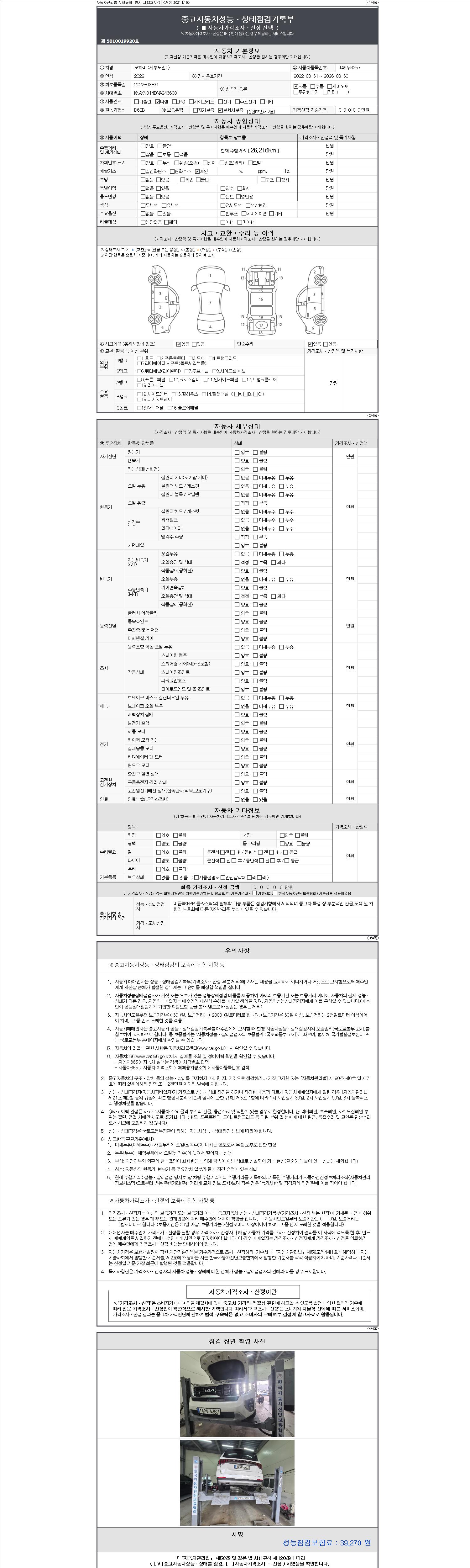 자동차관리법 시행규칙 제120조의 규정에 따라 별지 제 82호서식 《중고자동차 성능, 상태점검 기록부》를 발행한 성능, 상태점검자 및 매매자는 아래의 보증기간 또는 보증거리 이내의 중고자동차, 성능점검 기록부에 기재된 내용과 자동차의 실제 성능, 상태가 다른 경우 계약 또는 관계법령에 따라 매수인에 대하여 책임을 집니다.
