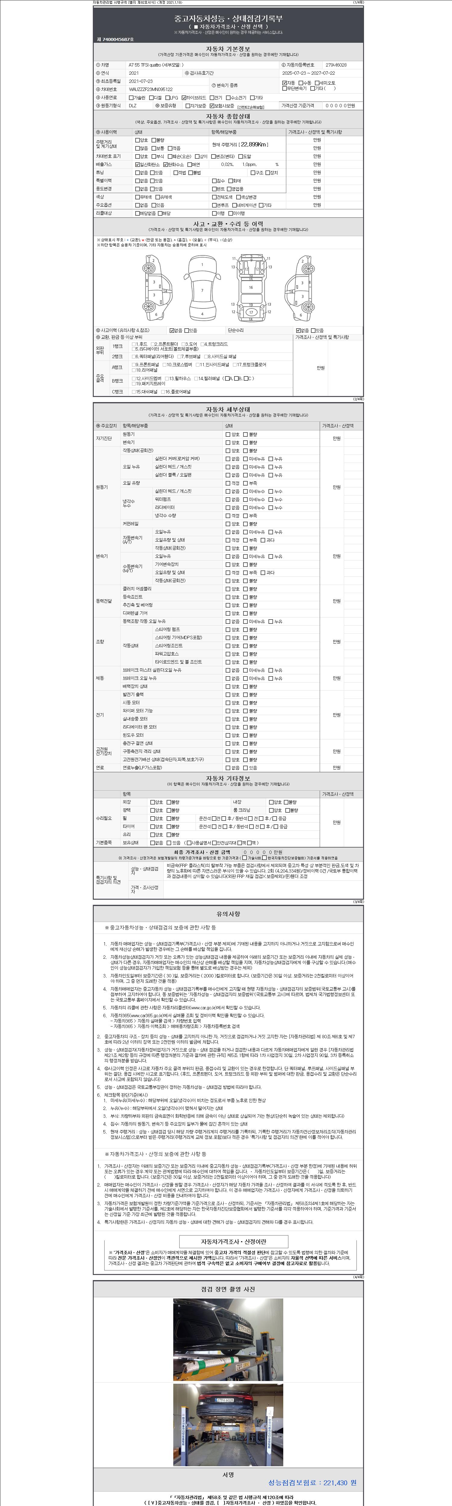 -중고자동차 매매업자를 통해 차량을 구입하실 경우 반드시 "중고자동차 성능, 상태점검 기록부"를 교뷰 받으셔야 하며, 매매업자는 반드시 의무 교부 하여야 압니다.