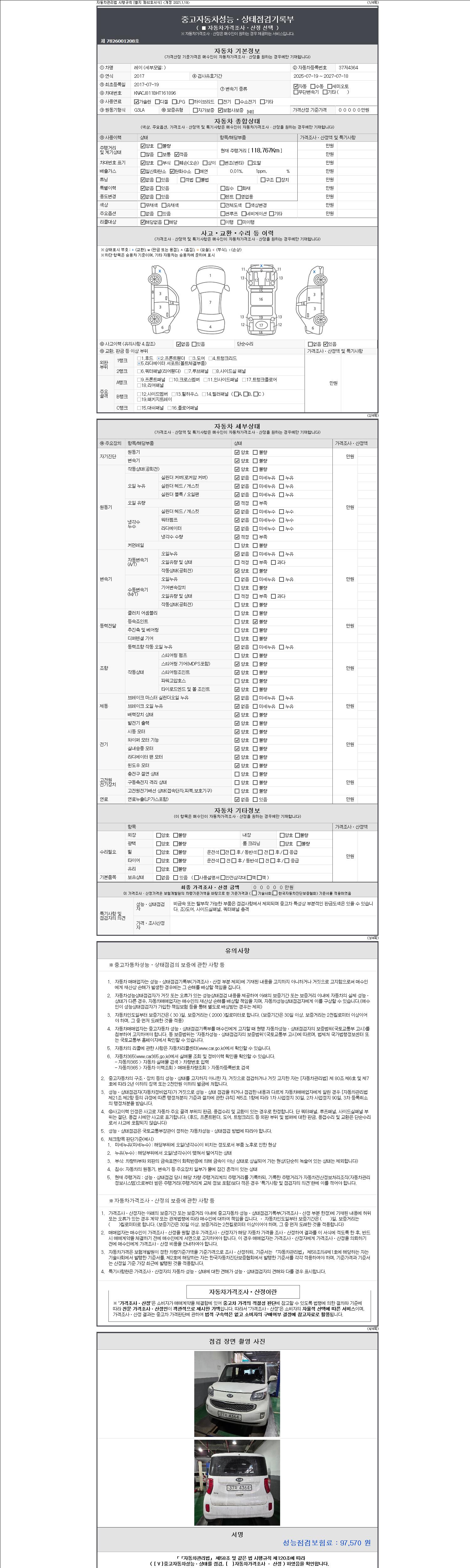 -중고자동차 매매업자를 통해 차량을 구입하실 경우 반드시 "중고자동차 성능, 상태점검 기록부"를 교뷰 받으셔야 하며, 매매업자는 반드시 의무 교부 하여야 압니다.