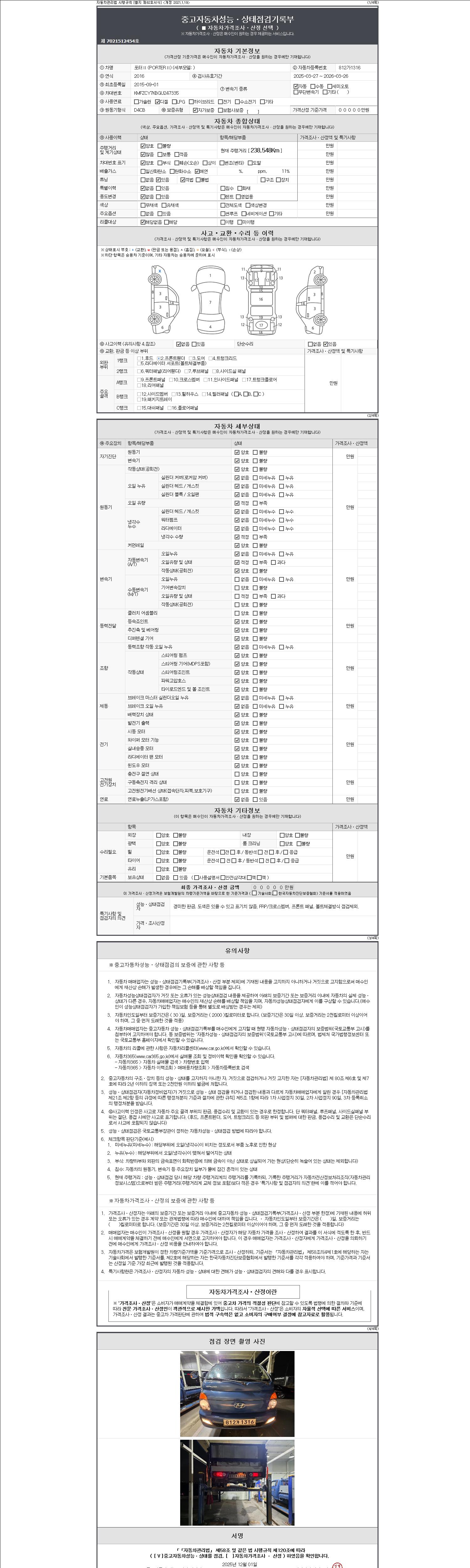자동차관리법 시행규칙 제120조의 규정에 따라 별지 제 82호서식 《중고자동차 성능, 상태점검 기록부》를 발행한 성능, 상태점검자 및 매매자는 아래의 보증기간 또는 보증거리 이내의 중고자동차, 성능점검 기록부에 기재된 내용과 자동차의 실제 성능, 상태가 다른 경우 계약 또는 관계법령에 따라 매수인에 대하여 책임을 집니다.