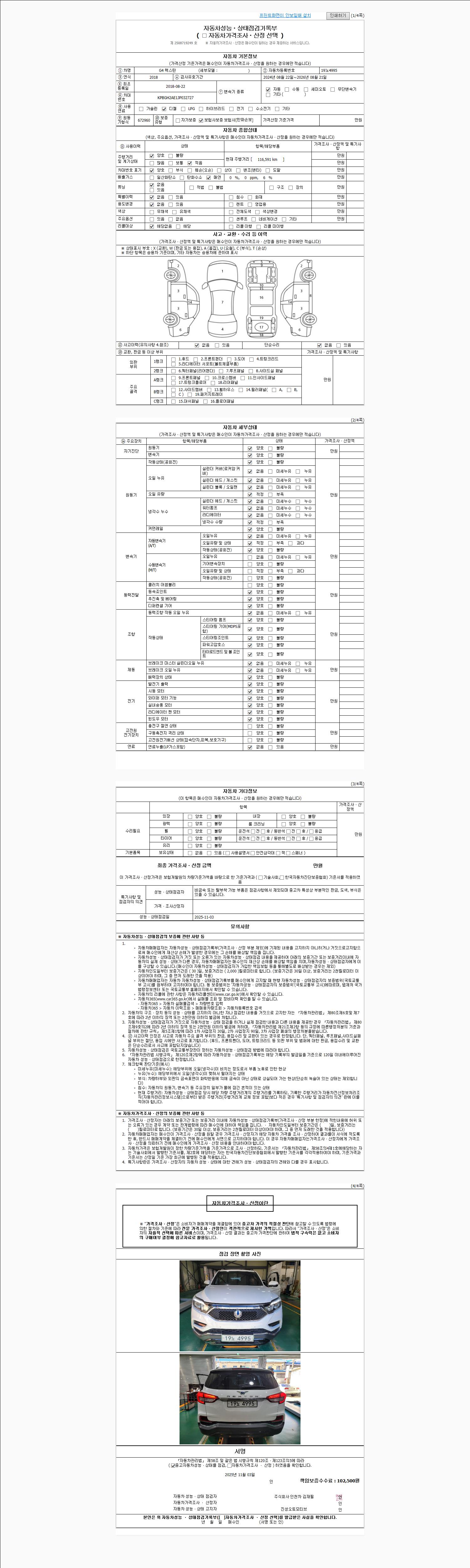 | 주행거리 | 116,591 km | 차량번호 | 19노4995 | 사고유무 | 성능기록부 참조 | 제시번호 | 제 2025059914 호 |