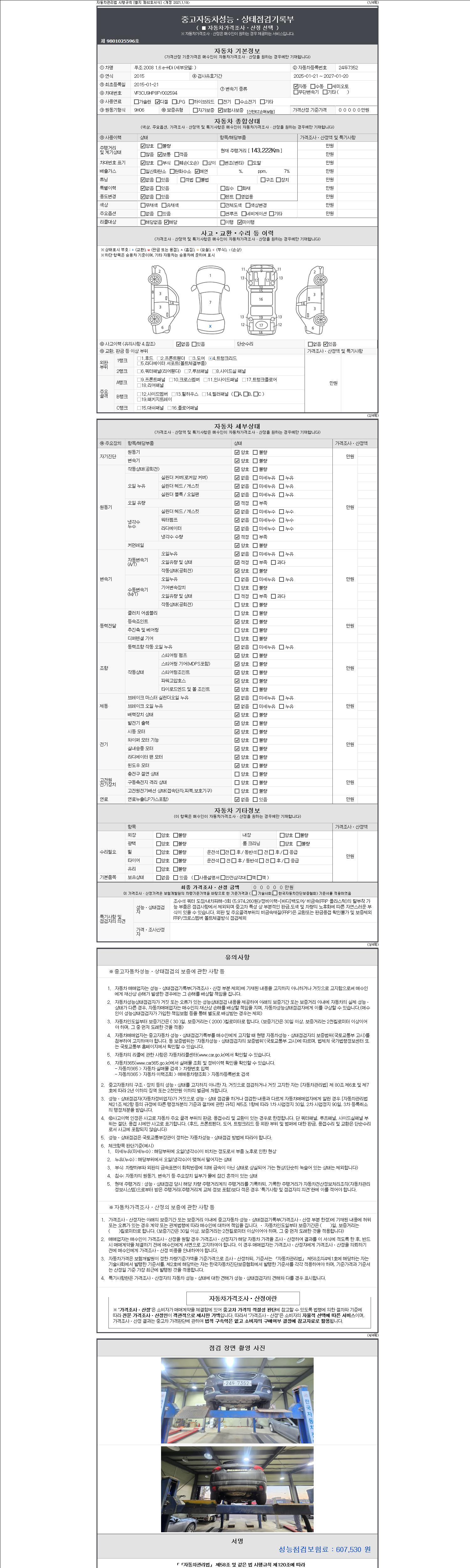 -중고자동차 매매업자를 통해 차량을 구입하실 경우 반드시 "중고자동차 성능, 상태점검 기록부"를 교뷰 받으셔야 하며, 매매업자는 반드시 의무 교부 하여야 압니다.