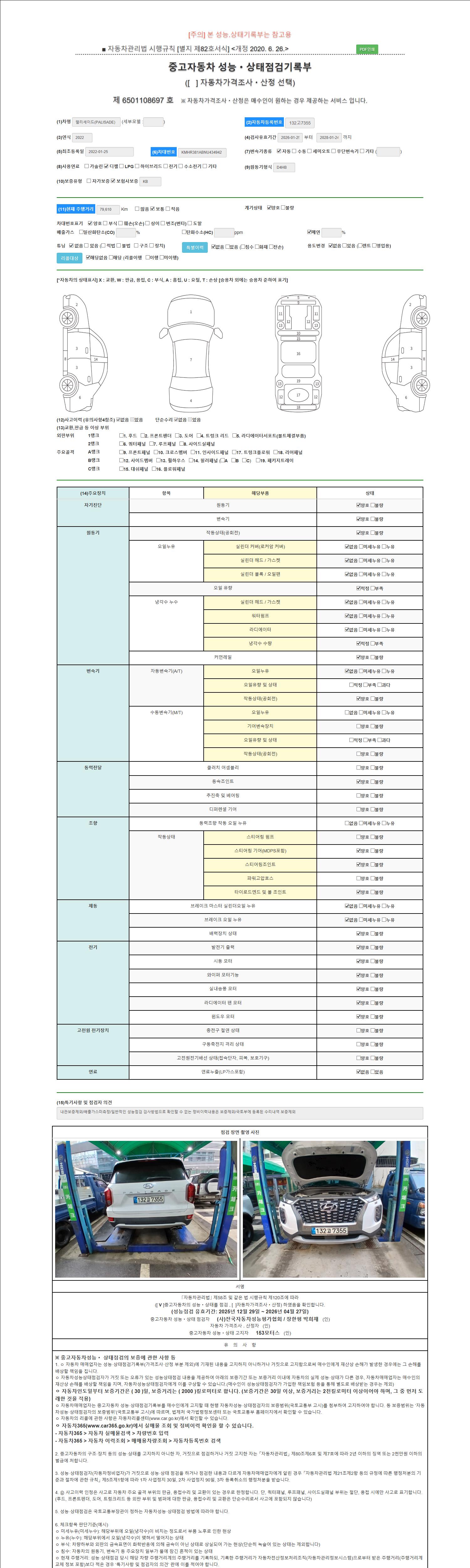 자동차관리법 시행규칙 제120조의 규정에 따라 별지 제 82호서식 《중고자동차 성능, 상태점검 기록부》를 발행한 성능, 상태점검자 및 매매자는 아래의 보증기간 또는 보증거리 이내의 중고자동차, 성능점검 기록부에 기재된 내용과 자동차의 실제 성능, 상태가 다른 경우 계약 또는 관계법령에 따라 매수인에 대하여 책임을 집니다.