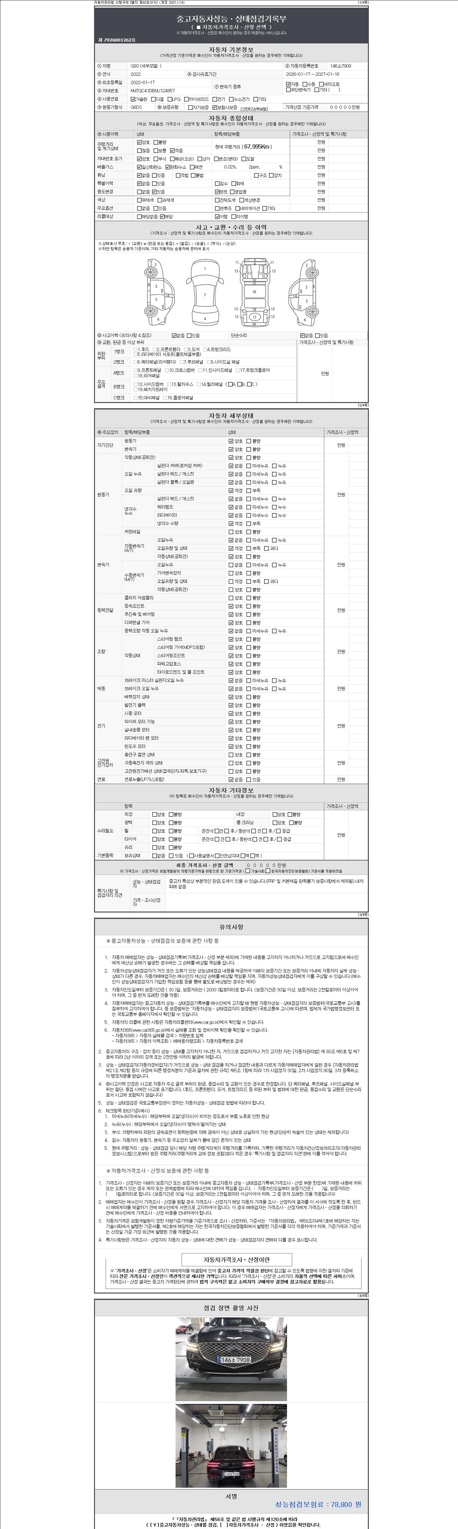 | 주행거리 | 67,995 km | 차량번호 | 146소7908 | 사고유무 | 성능기록부 참조 | 제시번호 | 제 2147483647 호 |