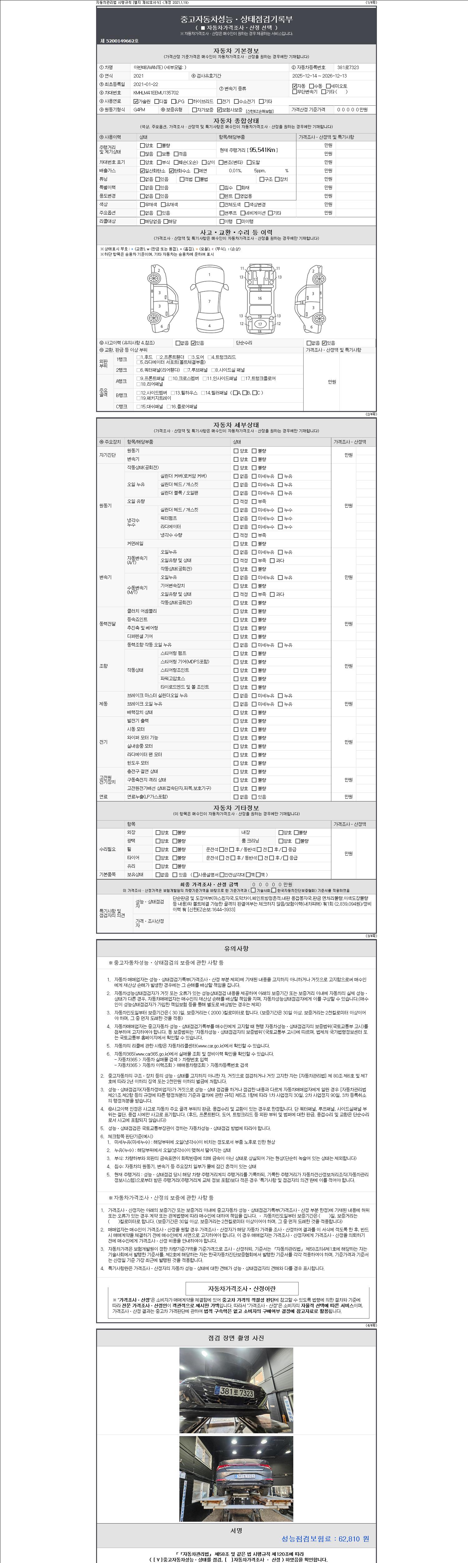 | 주행거리 | 95,536 km | 차량번호 | 381로7323 | 사고유무 | 성능기록부 참조 | 제시번호 | 제 2147483647 호 |
