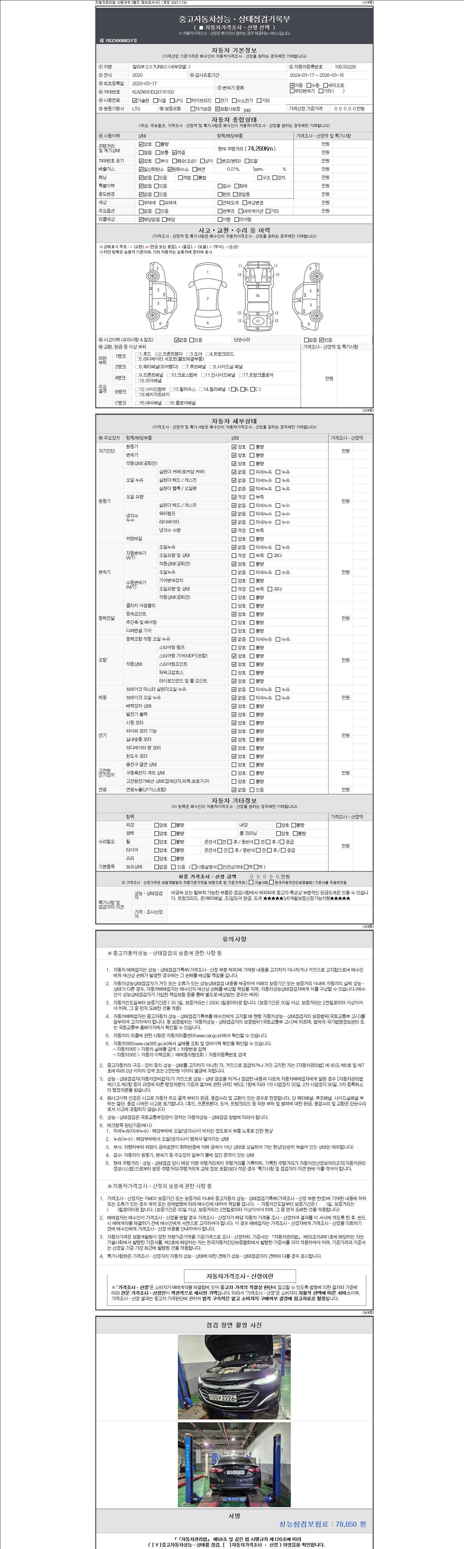 | 주행거리 | 74,260 km | 차량번호 | 105구2226 | 사고유무 | 성능기록부 참조 | 제시번호 | 제 2147483647 호 |