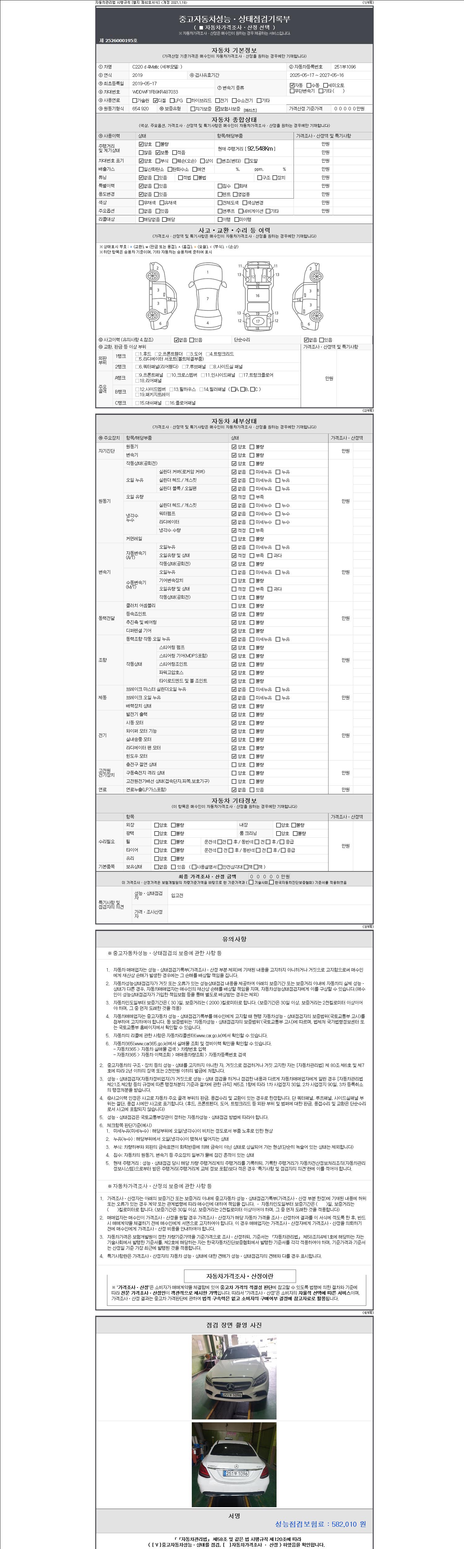 자동차관리법 시행규칙 제120조의 규정에 따라 별지 제 82호서식 《중고자동차 성능, 상태점검 기록부》를 발행한 성능, 상태점검자 및 매매자는 아래의 보증기간 또는 보증거리 이내의 중고자동차, 성능점검 기록부에 기재된 내용과 자동차의 실제 성능, 상태가 다른 경우 계약 또는 관계법령에 따라 매수인에 대하여 책임을 집니다.
