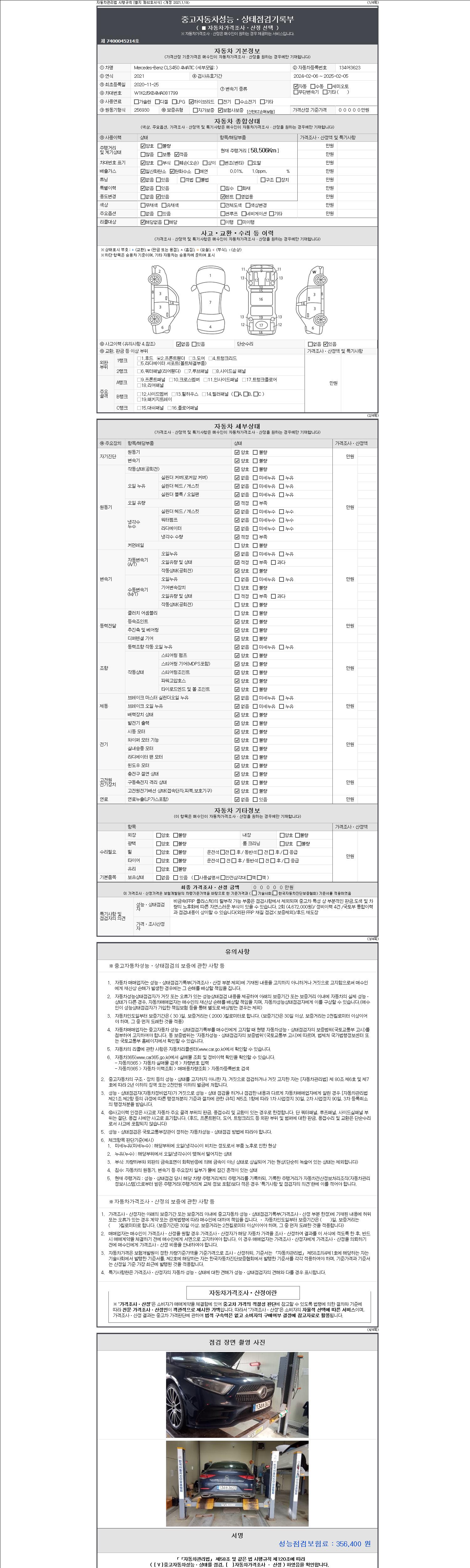 자동차관리법 시행규칙 제120조의 규정에 따라 별지 제 82호서식 《중고자동차 성능, 상태점검 기록부》를 발행한 성능, 상태점검자 및 매매자는 아래의 보증기간 또는 보증거리 이내의 중고자동차, 성능점검 기록부에 기재된 내용과 자동차의 실제 성능, 상태가 다른 경우 계약 또는 관계법령에 따라 매수인에 대하여 책임을 집니다.