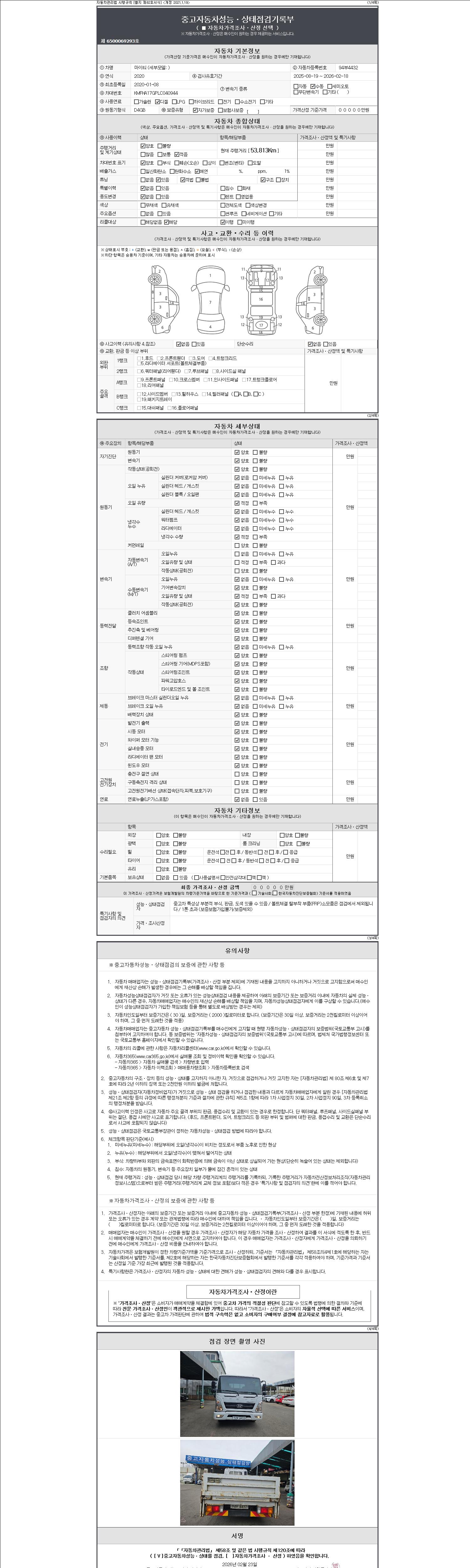 | 주행거리 | 53,813 km | 차량번호 | 94부4432 | 사고유무 | 성능기록부 참조 | 제시번호 | 제 2147483647 호 |