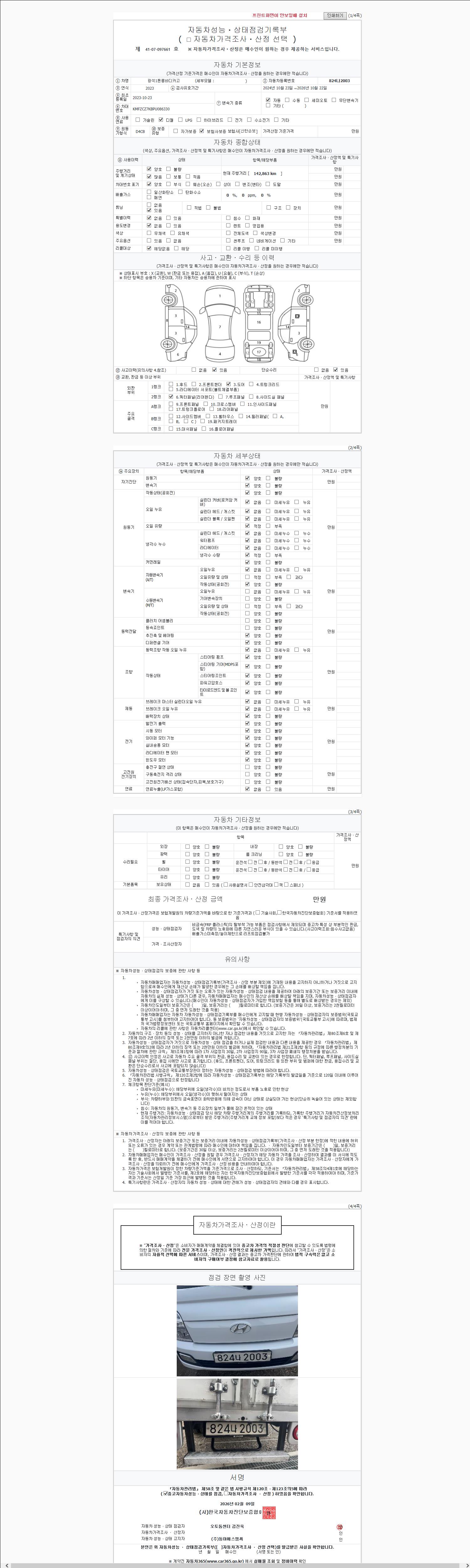 | 주행거리 | 142,842 km | 차량번호 | 824나2003 | 사고유무 | 성능기록부 참조 | 제시번호 | 제 2147483647 호 |