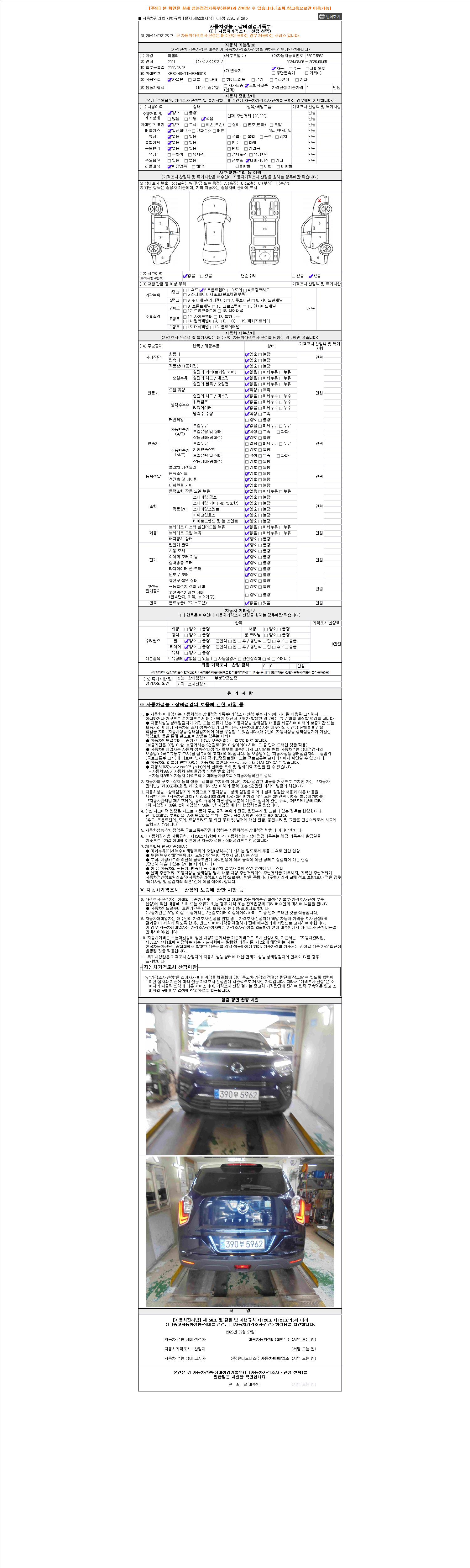 | 주행거리 | 26,033 km | 차량번호 | 390부5962 | 사고유무 | 성능기록부 참조 | 제시번호 | 제 2026025416 호 |