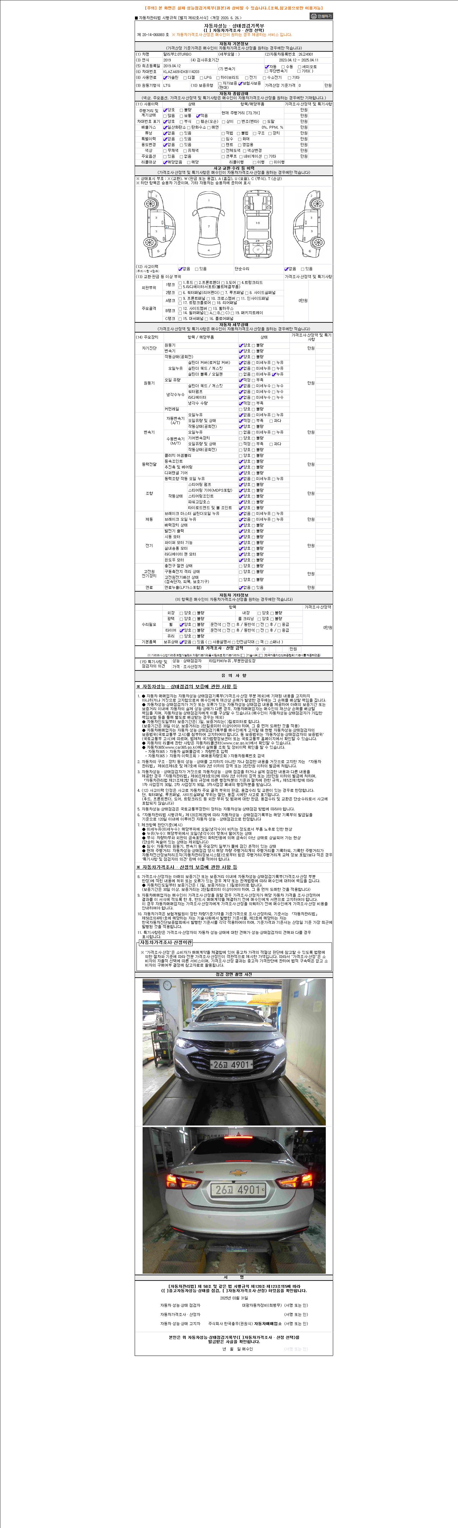| 주행거리 | 73,575 km | 차량번호 | 26고4901 | 사고유무 | 성능기록부 참조 | 제시번호 | 제 2025032263 호 |
