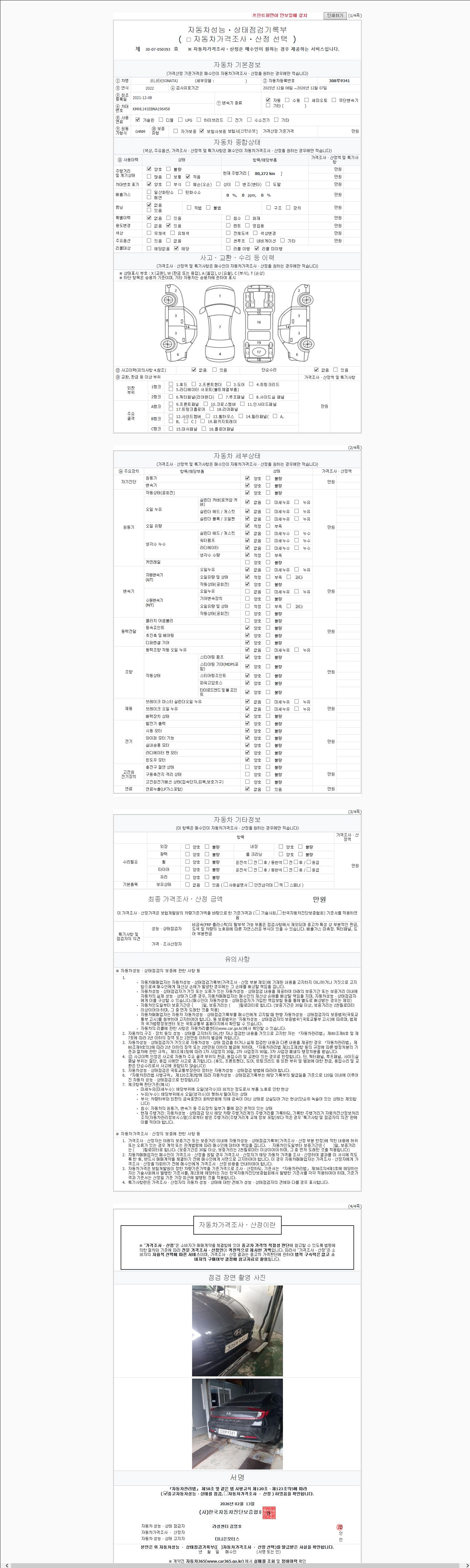 -중고자동차 매매업자를 통해 차량을 구입하실 경우 반드시 "중고자동차 성능, 상태점검 기록부"를 교뷰 받으셔야 하며, 매매업자는 반드시 의무 교부 하여야 압니다.