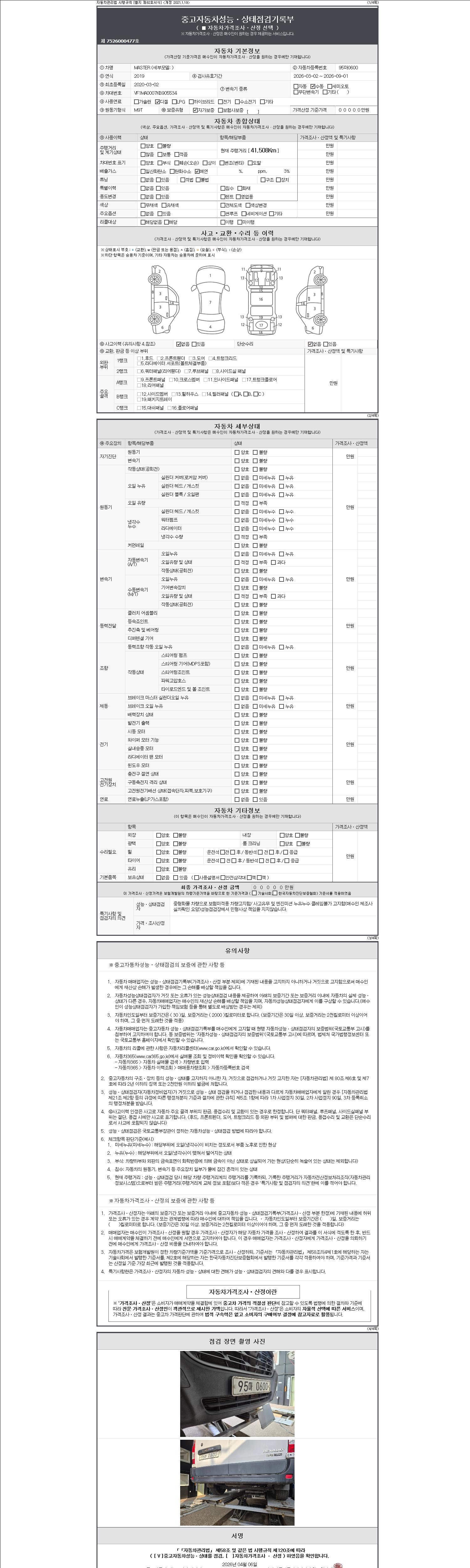 자동차관리법 시행규칙 제120조의 규정에 따라 별지 제 82호서식 《중고자동차 성능, 상태점검 기록부》를 발행한 성능, 상태점검자 및 매매자는 아래의 보증기간 또는 보증거리 이내의 중고자동차, 성능점검 기록부에 기재된 내용과 자동차의 실제 성능, 상태가 다른 경우 계약 또는 관계법령에 따라 매수인에 대하여 책임을 집니다.