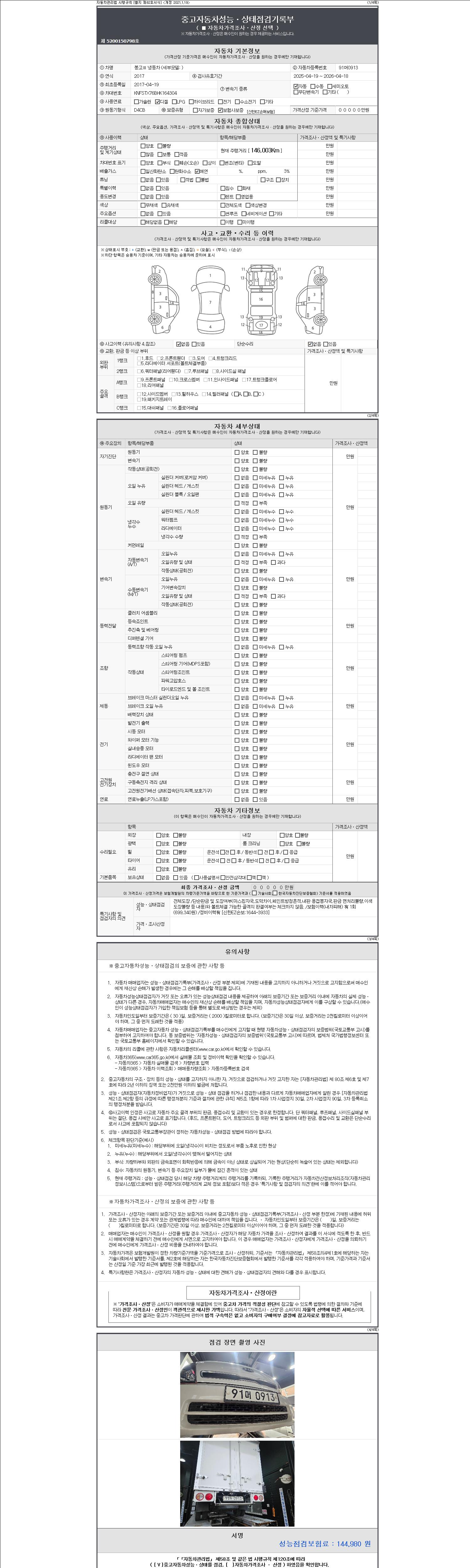 | 주행거리 | 145,972 km | 차량번호 | 91머0913 | 사고유무 | 성능기록부 참조 | 제시번호 | 제 2147483647 호 |