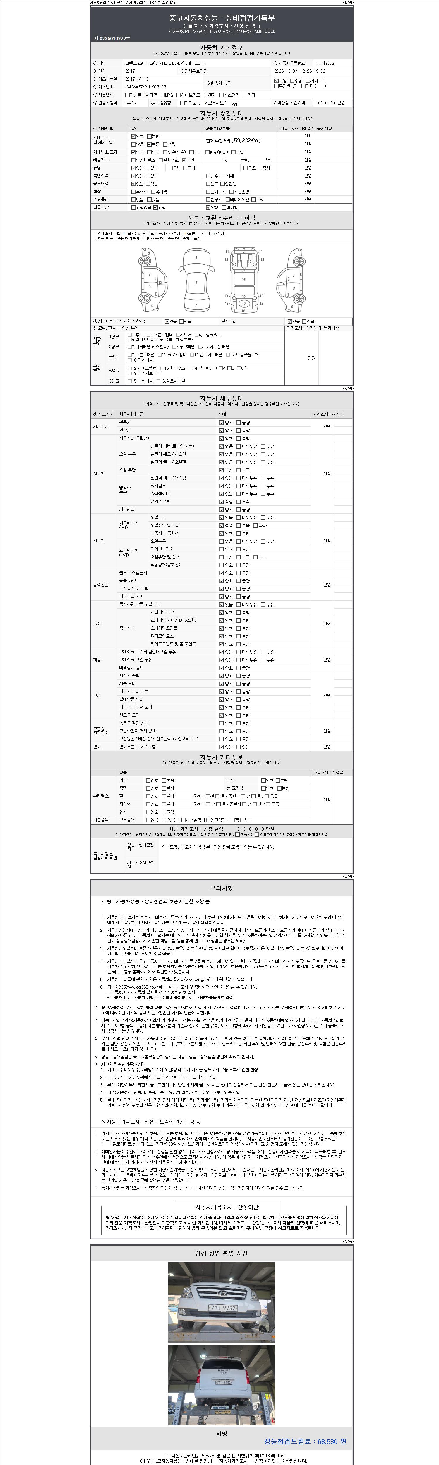 | 주행거리 | 59,232 km | 차량번호 | 71나9752 | 사고유무 | 성능기록부 참조 | 제시번호 | 제 2147483647 호 |