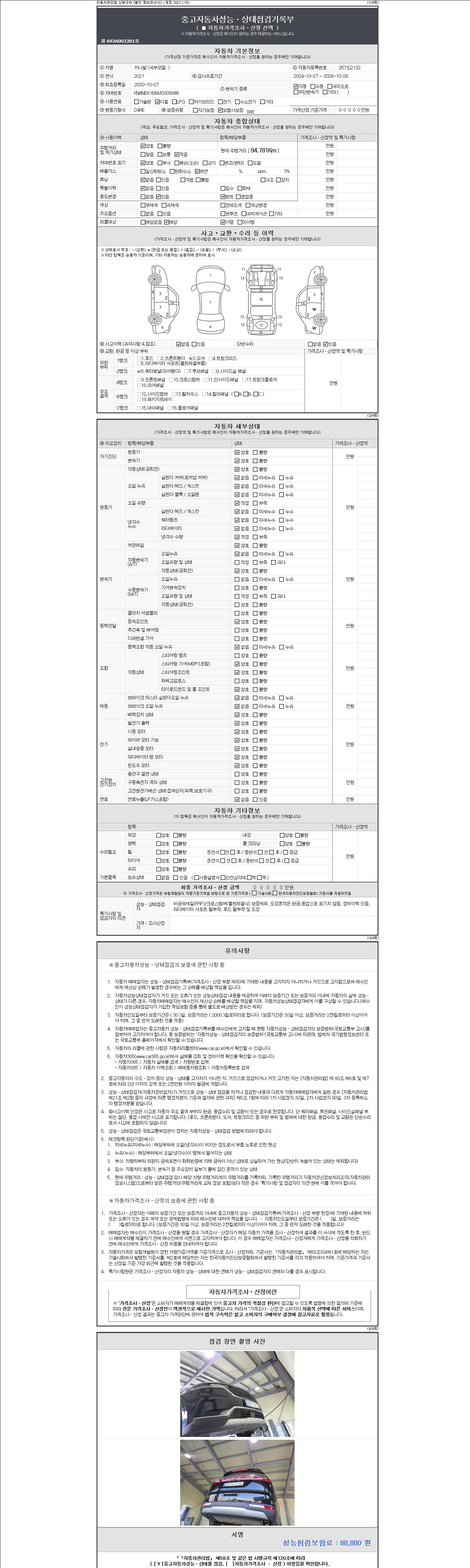 자동차관리법 시행규칙 제120조의 규정에 따라 별지 제 82호서식 《중고자동차 성능, 상태점검 기록부》를 발행한 성능, 상태점검자 및 매매자는 아래의 보증기간 또는 보증거리 이내의 중고자동차, 성능점검 기록부에 기재된 내용과 자동차의 실제 성능, 상태가 다른 경우 계약 또는 관계법령에 따라 매수인에 대하여 책임을 집니다.