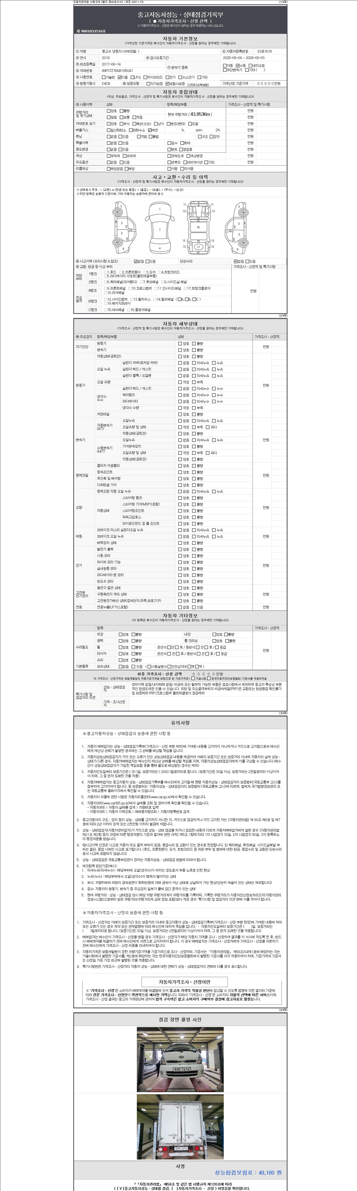 자동차관리법 시행규칙 제120조의 규정에 따라 별지 제 82호서식 《중고자동차 성능, 상태점검 기록부》를 발행한 성능, 상태점검자 및 매매자는 아래의 보증기간 또는 보증거리 이내의 중고자동차, 성능점검 기록부에 기재된 내용과 자동차의 실제 성능, 상태가 다른 경우 계약 또는 관계법령에 따라 매수인에 대하여 책임을 집니다.