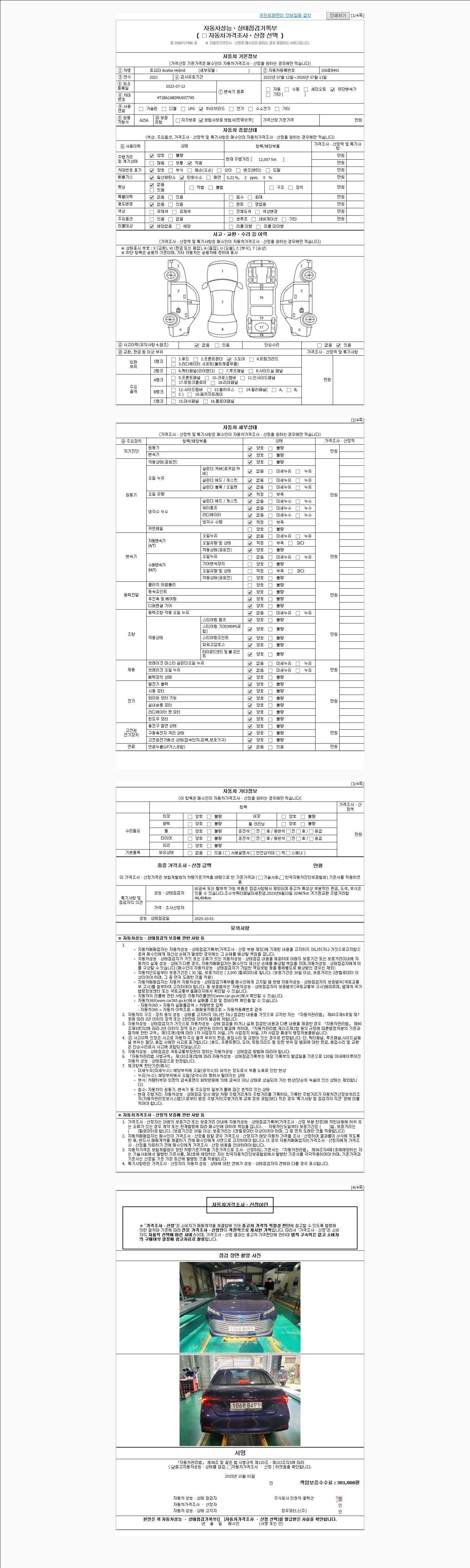 | 주행거리 | 12,007 km | 차량번호 | 106로8491 | 사고유무 | 성능기록부 참조 | 제시번호 | 제 2025028920 호 |