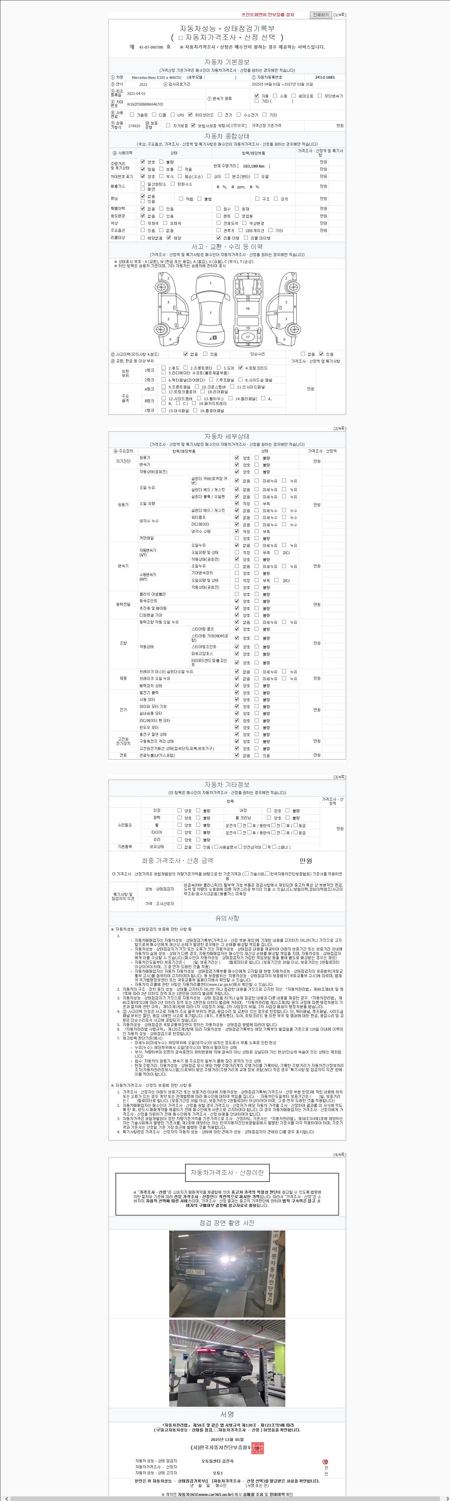 | 주행거리 | 103,180 km | 차량번호 | 243소1681 | 사고유무 | 성능기록부 참조 | 제시번호 | 제 2147483647 호 |