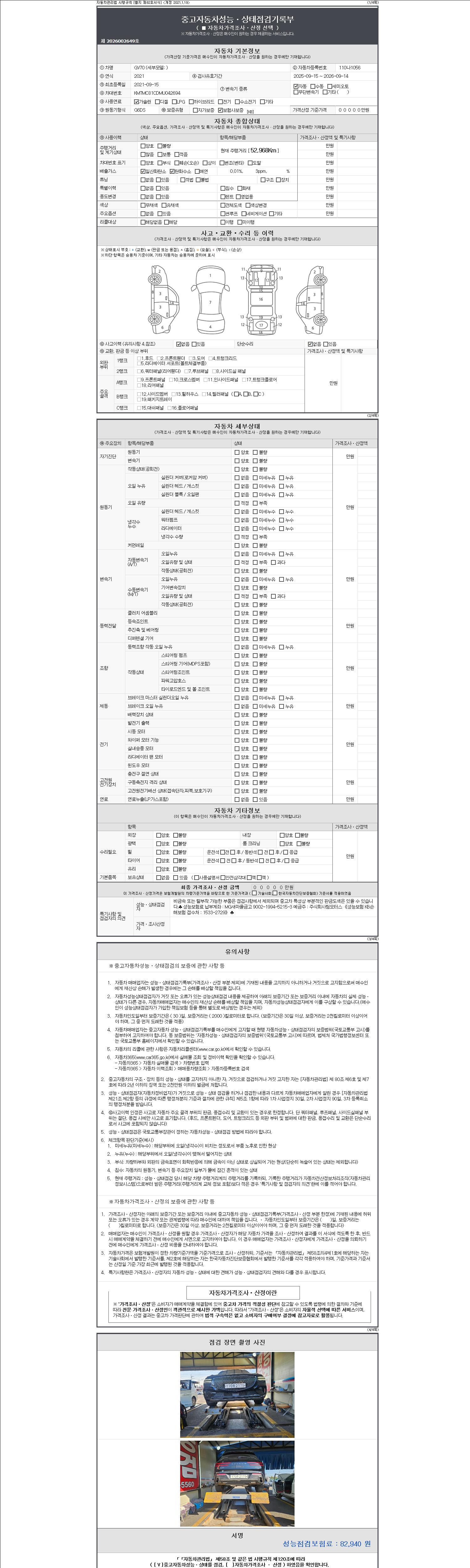 | 주행거리 | 52,968 km | 차량번호 | 110나1056 | 사고유무 | 성능기록부 참조 | 제시번호 | 제 2147483647 호 |
