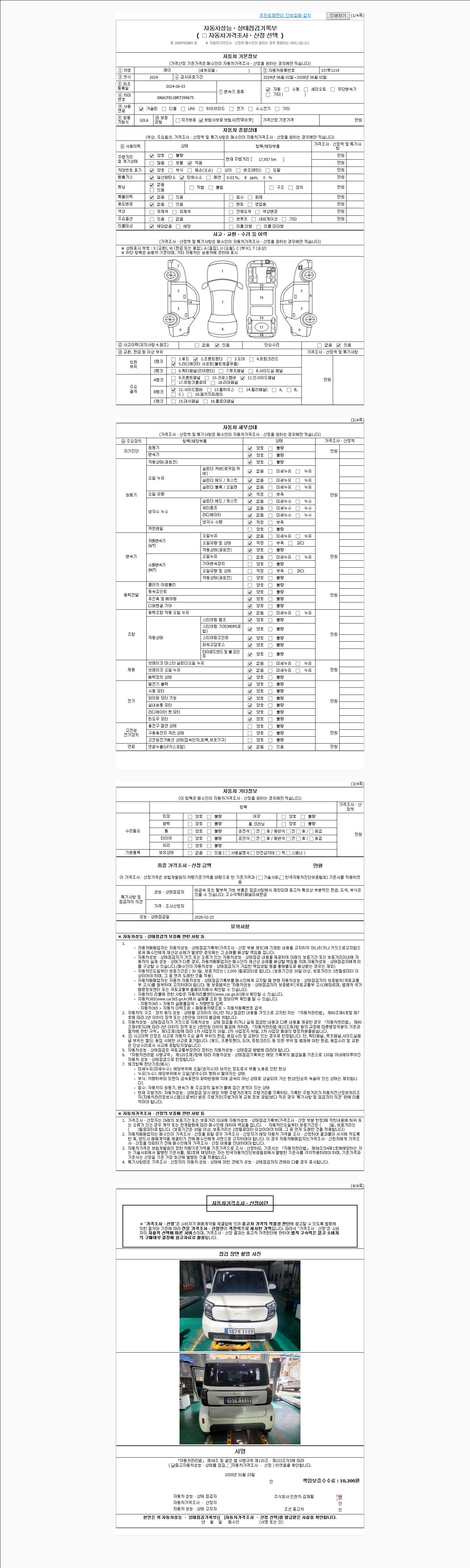 자동차관리법 시행규칙 제120조의 규정에 따라 별지 제 82호서식 《중고자동차 성능, 상태점검 기록부》를 발행한 성능, 상태점검자 및 매매자는 아래의 보증기간 또는 보증거리 이내의 중고자동차, 성능점검 기록부에 기재된 내용과 자동차의 실제 성능, 상태가 다른 경우 계약 또는 관계법령에 따라 매수인에 대하여 책임을 집니다.