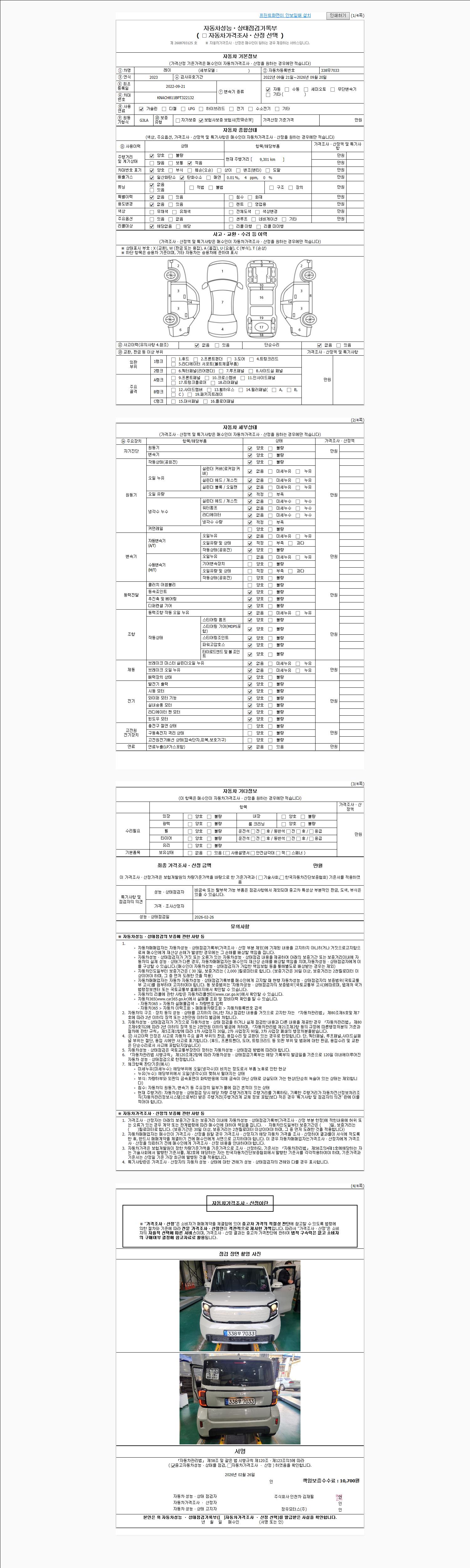 | 주행거리 | 9,301 km | 차량번호 | 338무7033 | 사고유무 | 성능기록부 참조 | 제시번호 | 제 2026009923 호 |